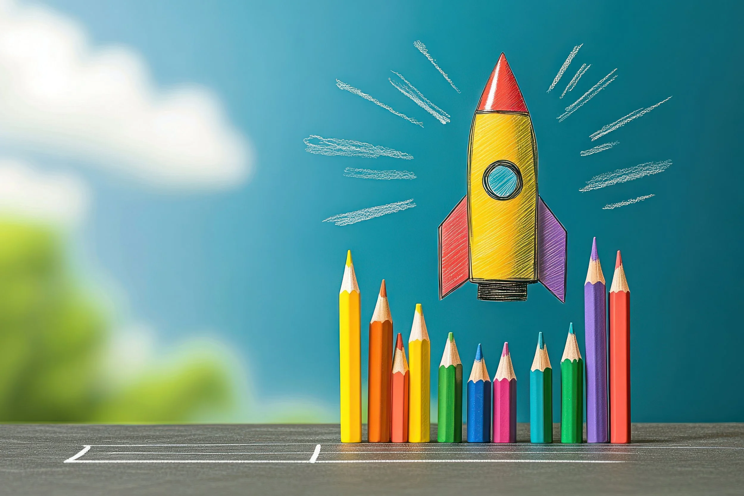 Colorful pencils arranged in ascending order with a paper rocket drawing on top, symbolizing growth or progress, against a blue sky with clouds background.