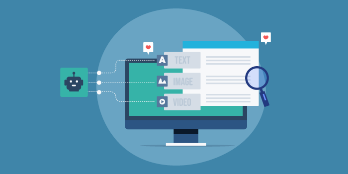 Digital illustration of a computer screen with text, image, and video editing options, a robot icon with connection lines, and a magnifying glass, symbolizing content creation and analysis.