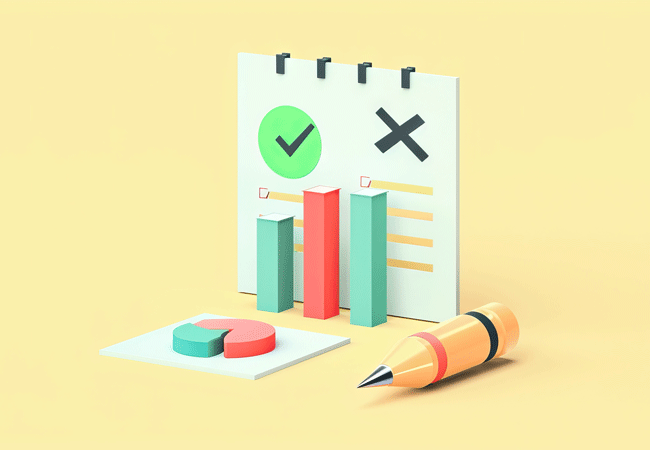 Colorful 3D bar chart with checkmark and cross symbols, pie chart, and a pen on a light yellow background.